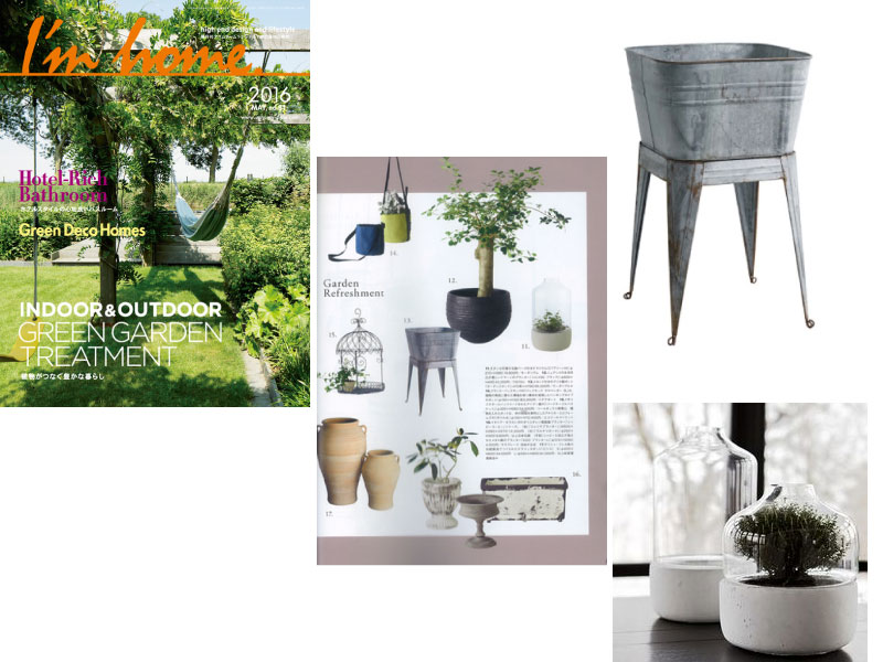 IIG COLLECTION 11. モダンな印象の石膏ベース付きテラリウム 「 CTグリーン H」Φ.21 H.38 CM 19,800 円 13.スタンド付きのブリキ製ポット「ガーデンスタンド」W.47 D.47 H.79 CM 65,500 円