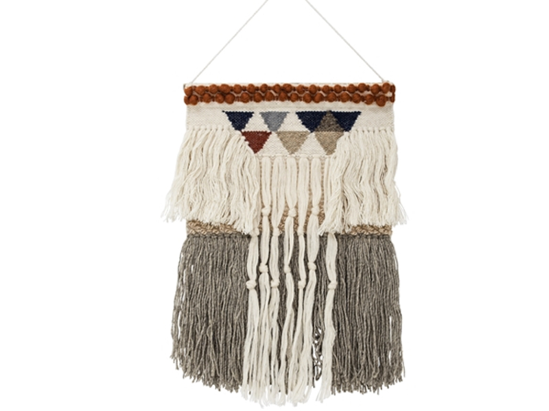 揺れるフリンジが魅力のタペストリーは、エッジの効いた模様と素材が印象的。