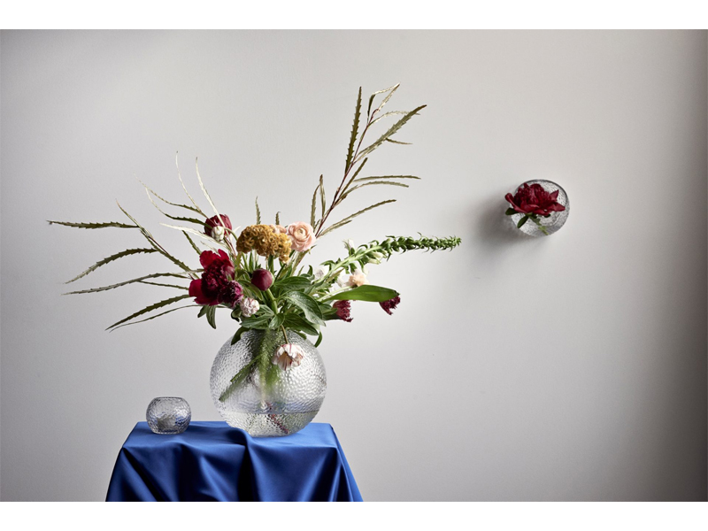 細かな凹凸の在るグラスベースは、花を生けていただくとエレガントでフェミニンな装いに。