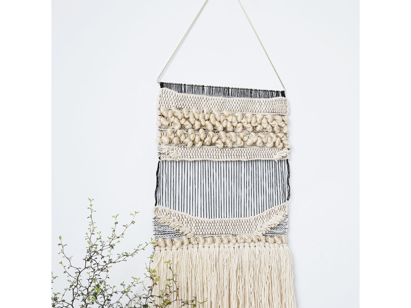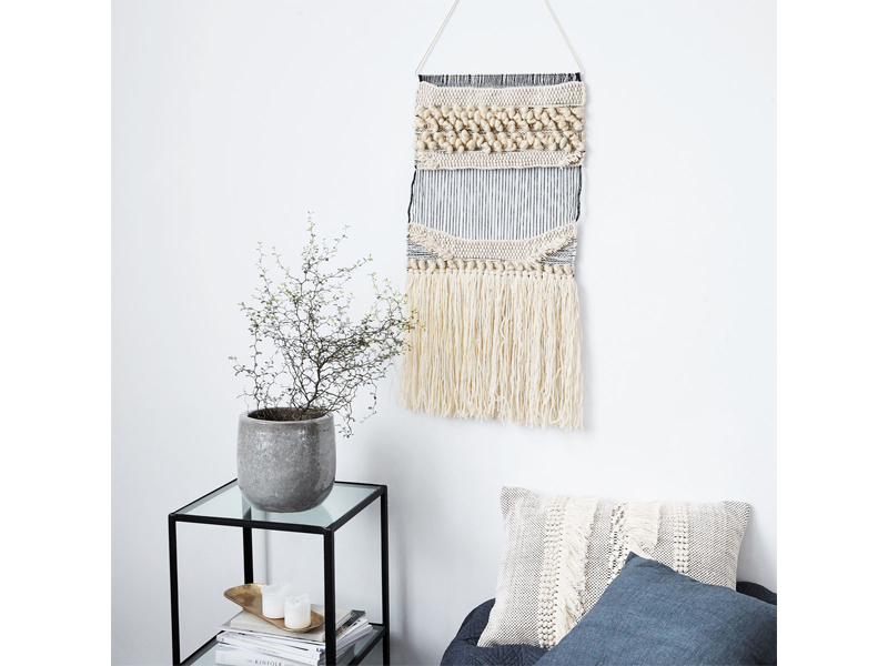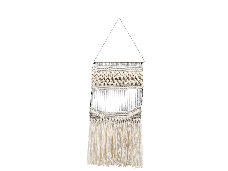揺れるフリンジが魅力のタペストリーは、エッジの効いた模様と素材が印象的。
