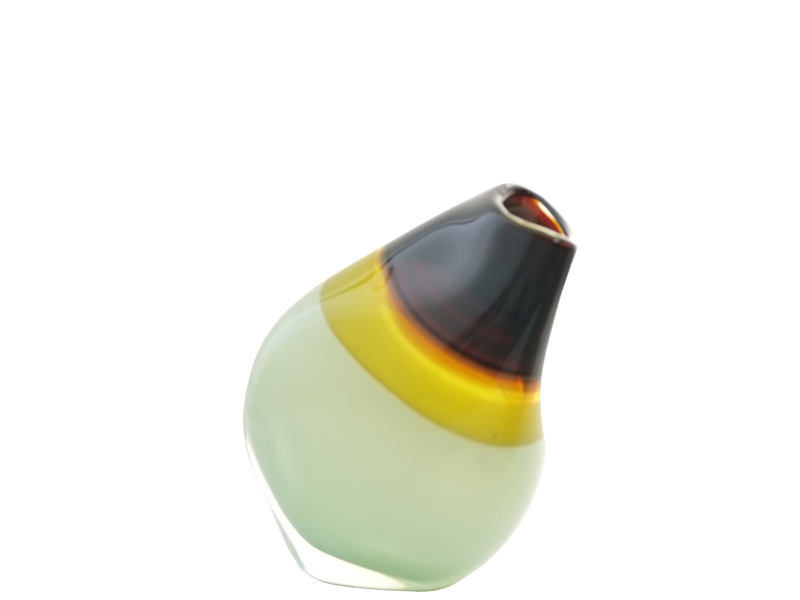 彼女の作品は、融解した色が他の色に染み出すときに作 られる柔らかいラインを描写した美しいデザインが特徴です。テキスタイルを学んだ彼女らしい このムードある 優美なカラーブリードは、布に染料が広がっていく 染織を彷彿とさせます。 一度成形したガラスの上からもう一度厚い色ガラスの層で覆う スウェーデンの伝統的なグラール技法を用いて、 透明性と不透明性とのバランスを模索していきます。
