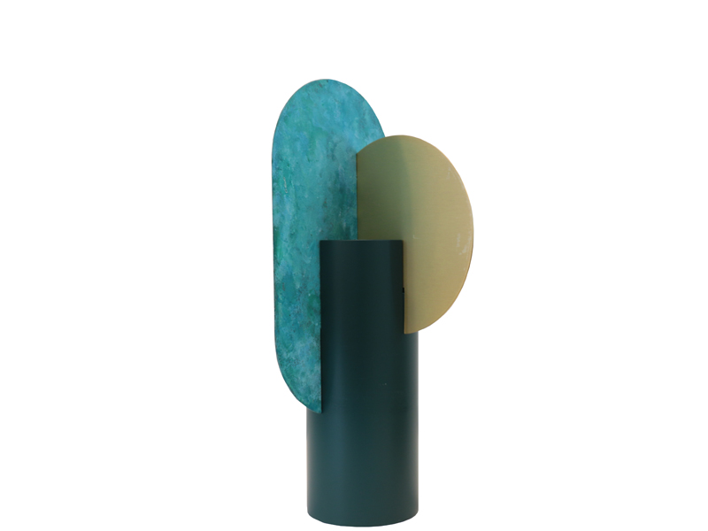 ベースとなるスチールにコッパーやブロス、パティー ナといった円型や長円などの形をはめ込んだようなデ ザインは、カラーと素材の組み合わせが絶妙です。