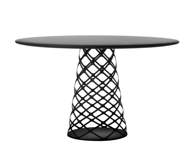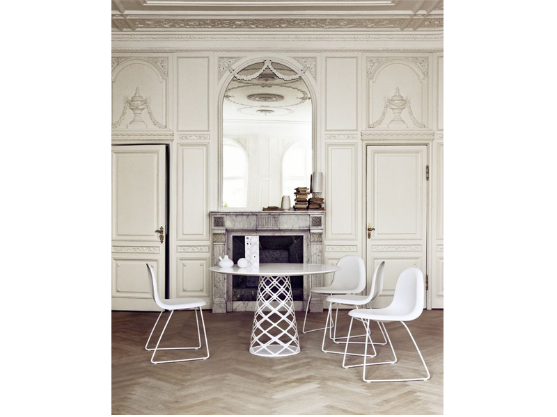 レーザーカットされたスチールの脚は、ユニークで視覚的な軽さを生み出します。