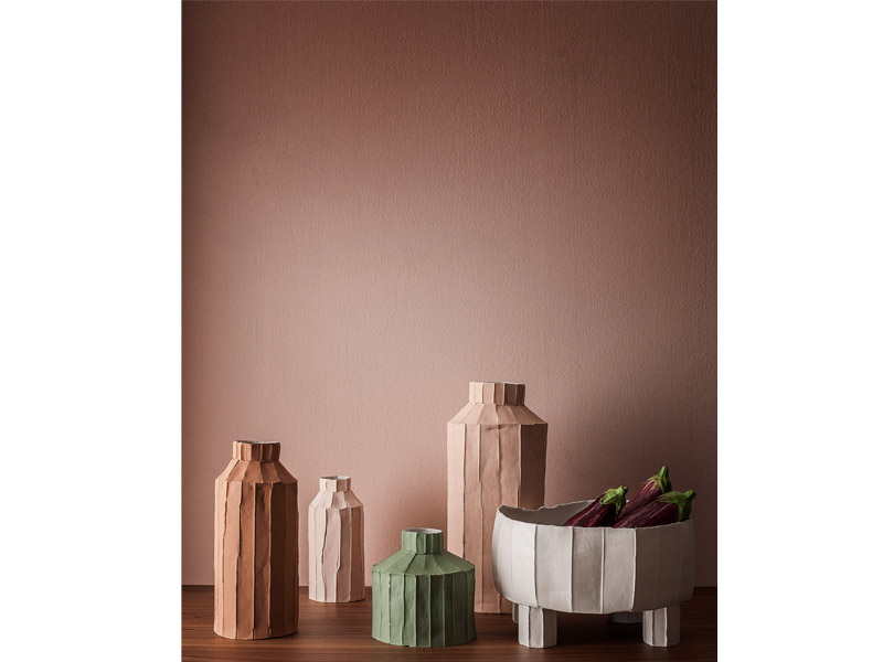 紙パルプ・天然繊維・粘土をブレンドさせた彼女独自のマテリアルにより作り出されるその世界観は、シンプルなデザインがより 自然の美しさを彷彿とさせ、彼女自身の感情を表現する手段として 製作活動を続けています。