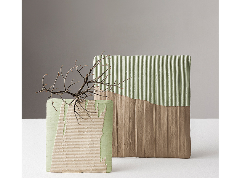 紙パルプ・天然繊維・粘土をブレンドさせた彼女独自のマテリアルにより作り出されるその世界観は、シンプルなデザインがより 自然の美しさを彷彿とさせ、彼女自身の感情を表現する手段として 製作活動を続けています。