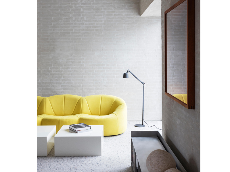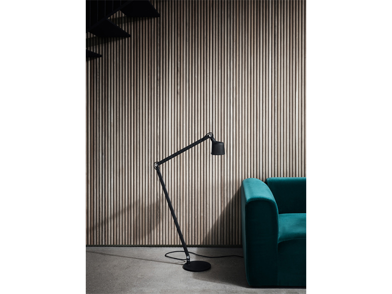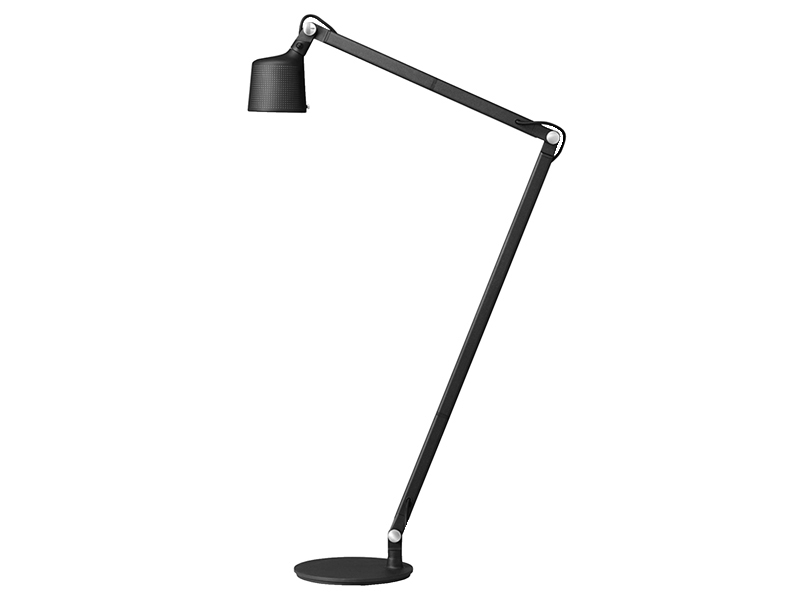 調節可能なアームと 心地よく光を拡散させるために穴あきのシェードとマットガラスでデザインされた vipp フロアランプ。