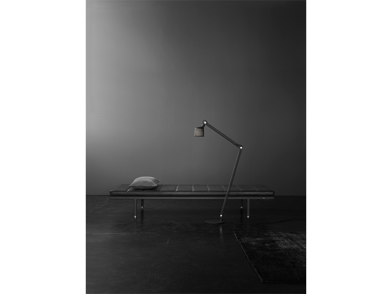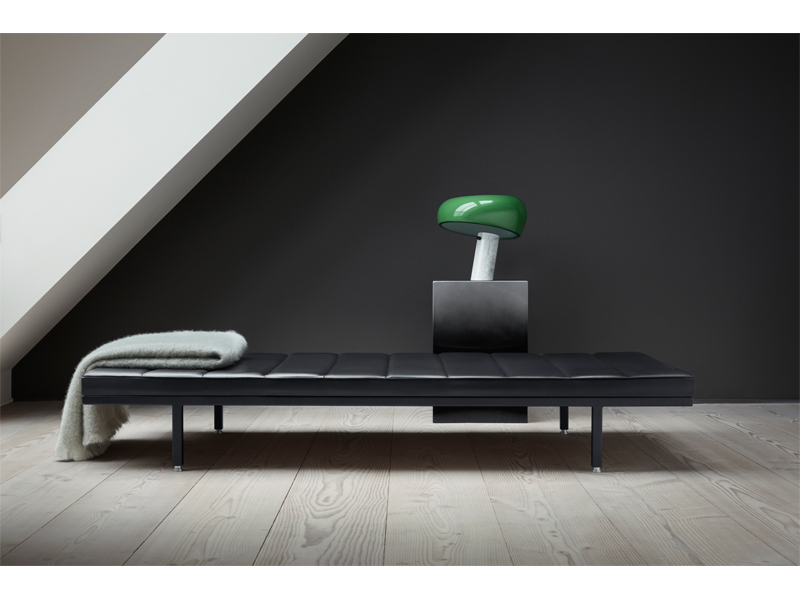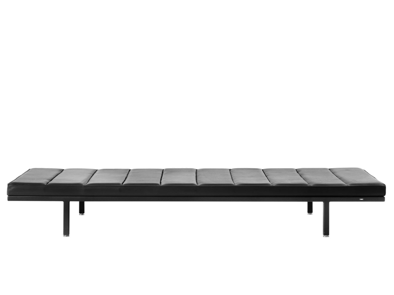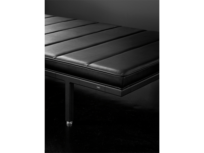 ブラックスチールにブラックレザーを組み合わせたミニマルでモダンなデザインのベンチ。