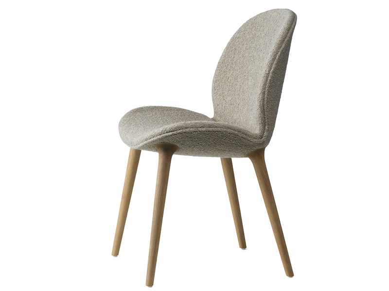 貝殻からインスパイアされたシェルのようなデザインとオーク材の脚の組み合わせは優しい風合いを作り出します。
