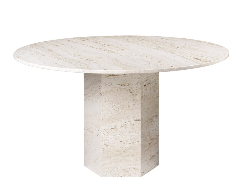 古典的なギリシャの柱やコロッセオや サンピエトロ大聖堂などのローマ建築 にインスパイアされてデザインした 彫刻的なテーブルは、イタリアのトラバーチンを使用した 継ぎ目のないフォルムや、石の自然の美しさとその独特な質感がユニークなデザインです。
