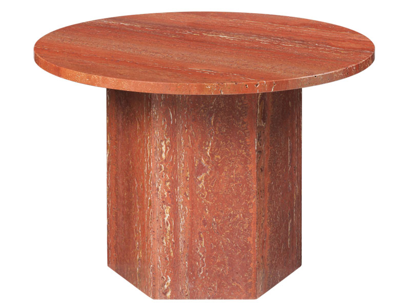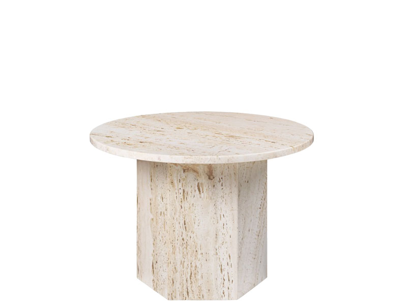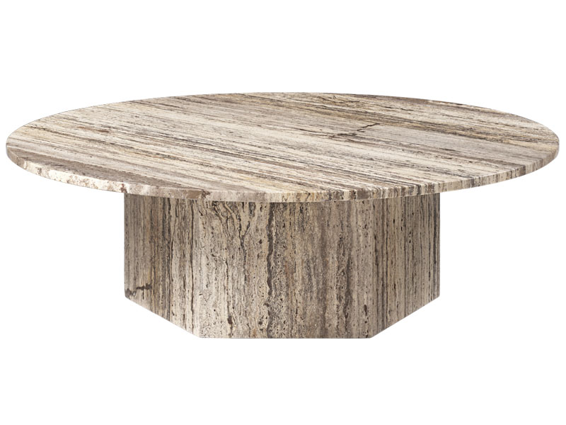 古典的なギリシャの柱やコロッセオや サンピエトロ大聖堂などのローマ建築 にインスパイアされてデザインした 彫刻的なテーブルは、イタリアのトラバーチンを使用した 継ぎ目のないフォルムや、石の自然の美しさとその独特な質感がユニークなデザインです。