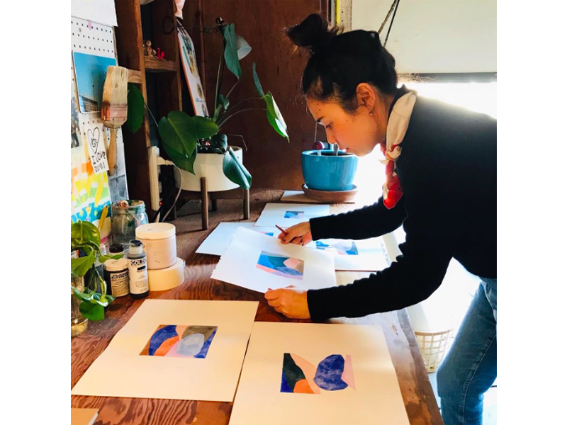 幼少期に過ごした 海が近く、森や緑に囲まれた青森の環境の影響 を受けた彼女は、自然と文化を融合させた作風が特徴です。 南カリフォルニアの活気溢れる環境と日本の文化的なバックグラ ウンドからインスパイアされ作品を生み出しており、その繊細で 抽象的なスタイルは、はっきりとした色使いをうまくまとめています。