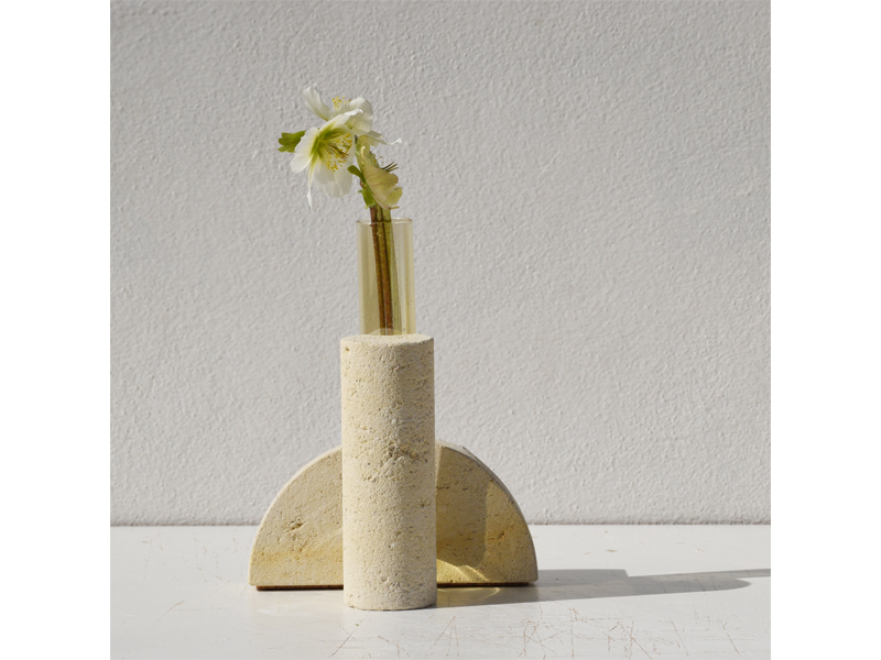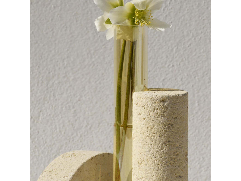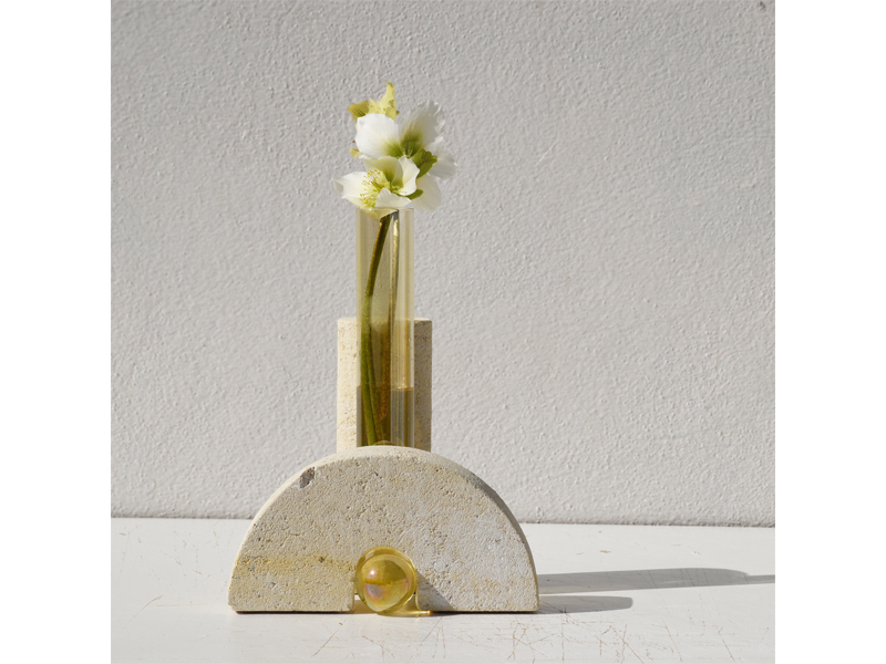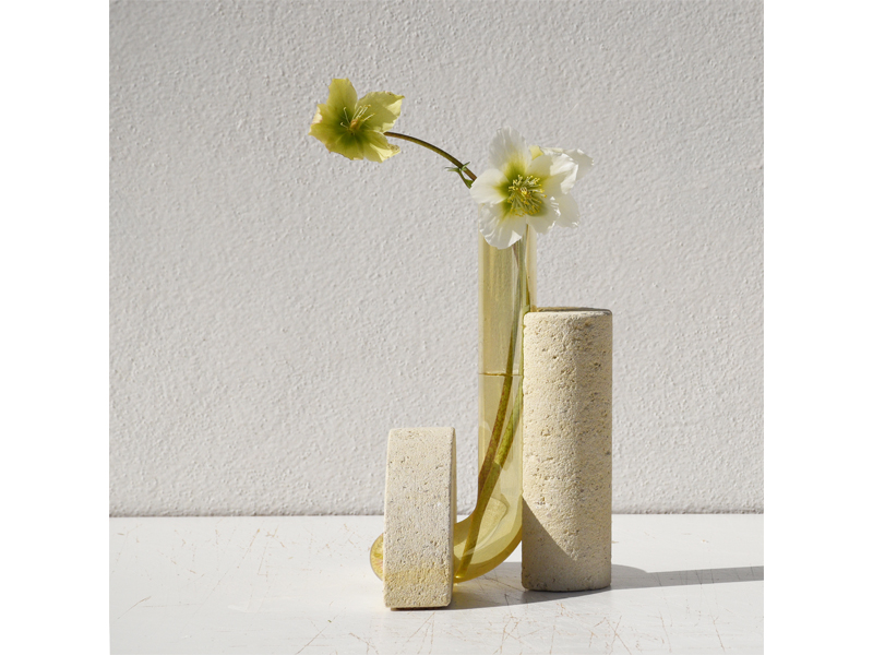 各段階で石とガラスのコンポーネントのフォルムが変わり、様々な形をとるデザインは 3つのパーツから成り、石はカタツムリの殻を連想させ、ガラス部分は体を表しています
