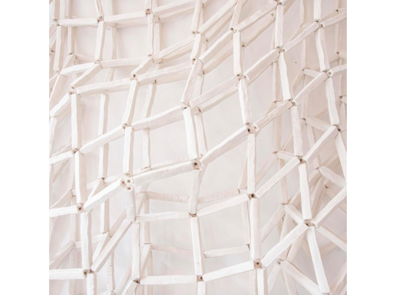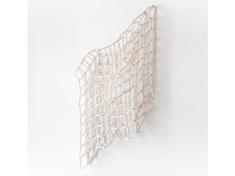彼女のアートワークはセラミックのピースを幾何学的なグリッドとパターンに沿うよう 注意深く組み合わせることで構成されています。 彼女はマテリアルを過度にコントロールするのではなく、意のま まにならない難しさを受け入れながら、素材を扱う姿勢をとっています。そのユニークなデザインにより、マテリアルの脆さや不完全さを感じとっていただける作品です。
