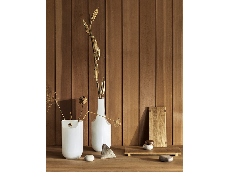 シンプルなデザインと滑らかな曲線が繊細な美しさを奏でるフラワーベースは、口吹で製作されたオパールガラスが上品な雰囲気を作ります。