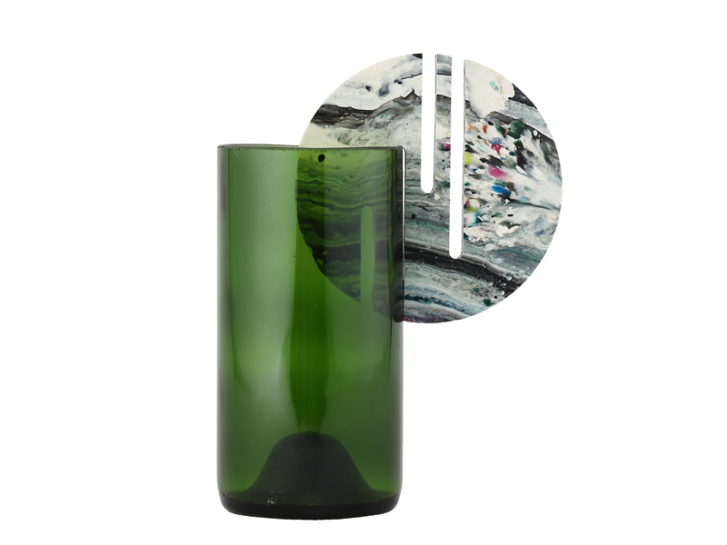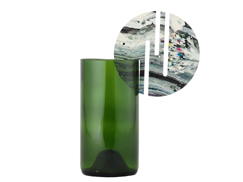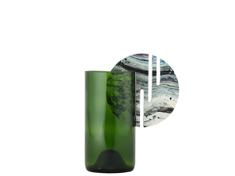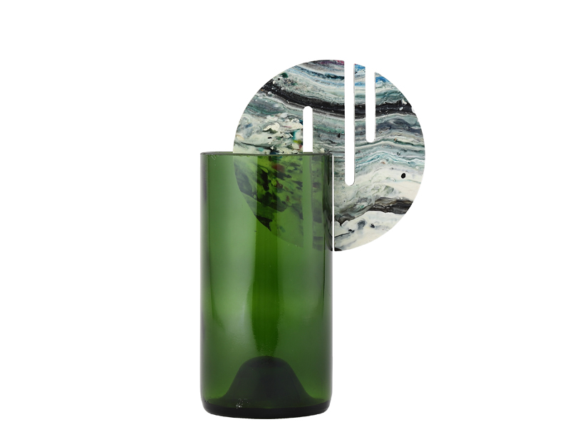 全てリサイクル品から作られたサステナブルな作品。フラワーベースに添えられたディスクは、抽象画を思わせる色と模様で どれもユニーク。ガラスの色はグリーンとクリアの2色で、大小のサイズがあります。