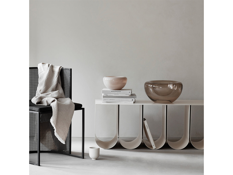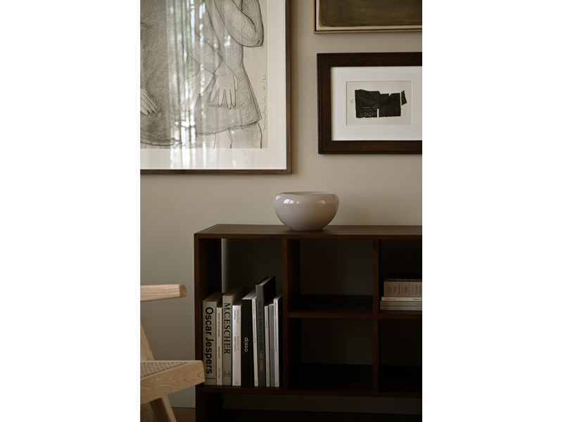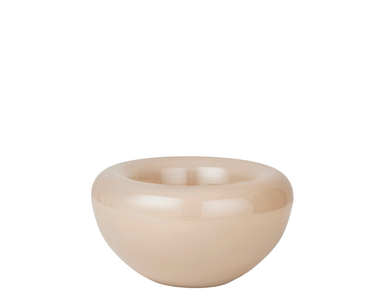伝統的なサービングボウルを現代風にアレンジしたオパールボウルは、まさにセンターピースとしてふさわしい逸品です。独特の二重構造が、吹きガラスの透明感を際立たせています。内側にはエレガントなベージュのペイントが施されています。