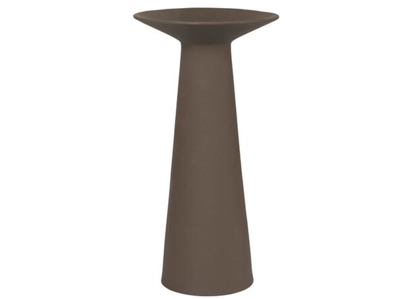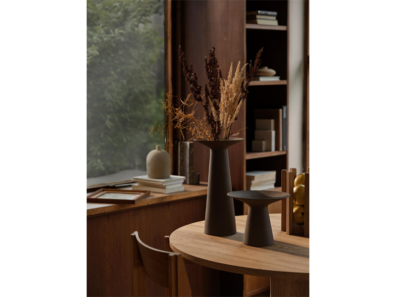 シンプルで彫刻的なデザインのカラーベースは、「彫刻的なミニマリズム」を表現しています。マットブラウン仕上げのテラコッタ製で、内側は釉薬がかけられており、特徴的なフォルムが特徴です。