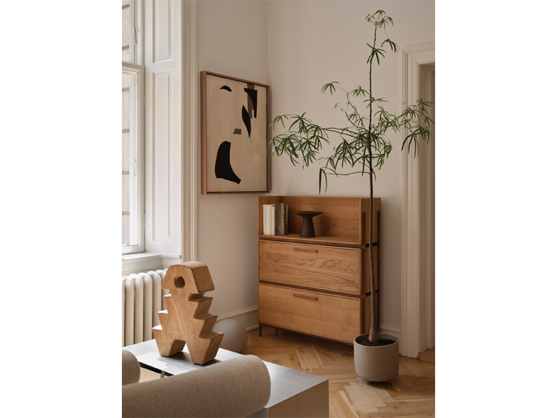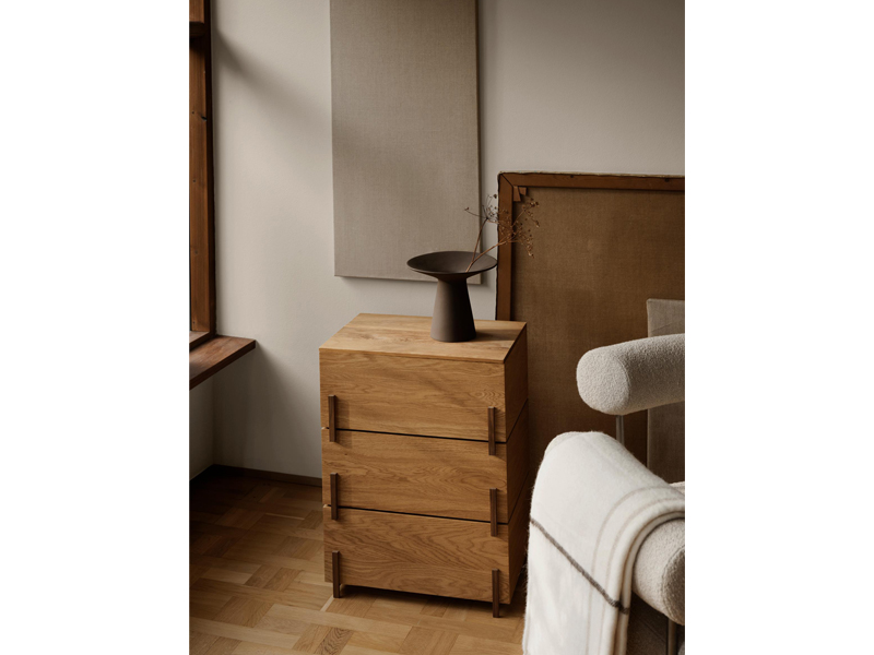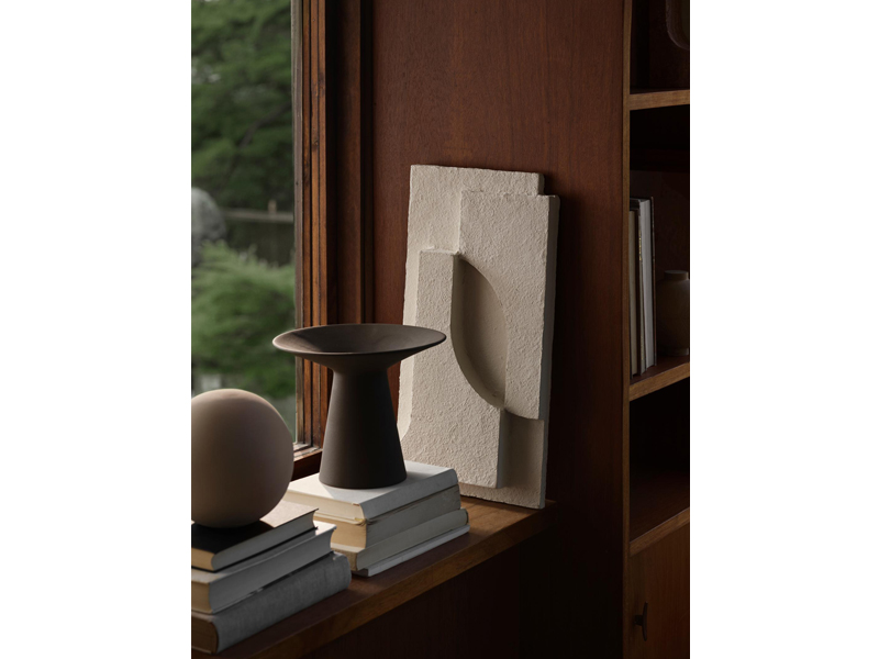シンプルで彫刻的なデザインのカラーベースは、「彫刻的なミニマリズム」を表現しています。マットブラウン仕上げのテラコッタ製で、内側は釉薬がかけられており、特徴的なフォルムが特徴です。
