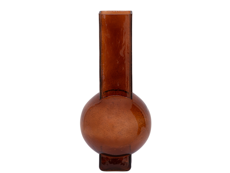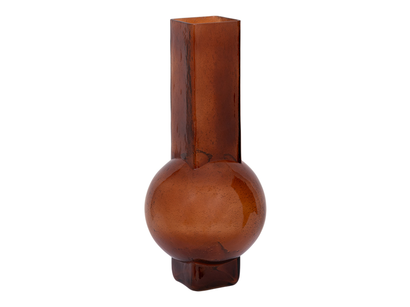 デザインと循環型経済の融合を示したイヴベース。リサイクルガラスを使用したこのハンドメイドの花瓶は、抽象的なデザインと幾何学模様が有機的な雰囲気と融合し、スクエアなネックと脚、そして丸みを帯びたボディがモダンなシルエットを生み出しています。形と色彩が織りなすこのガラスの花瓶は、存在感を発揮します。