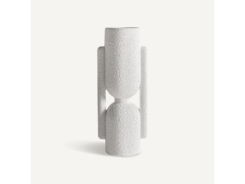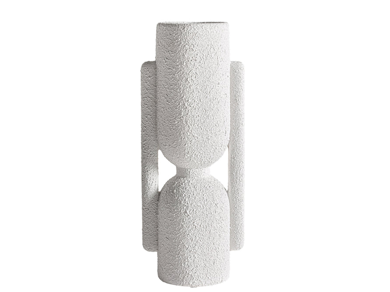 白い陶器にラフな仕上げを施したベースは、その有機的なフォルムと落ち着いた存在感が際立っています。