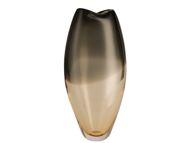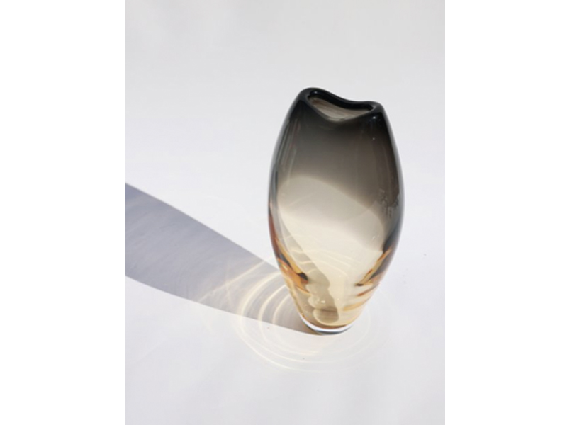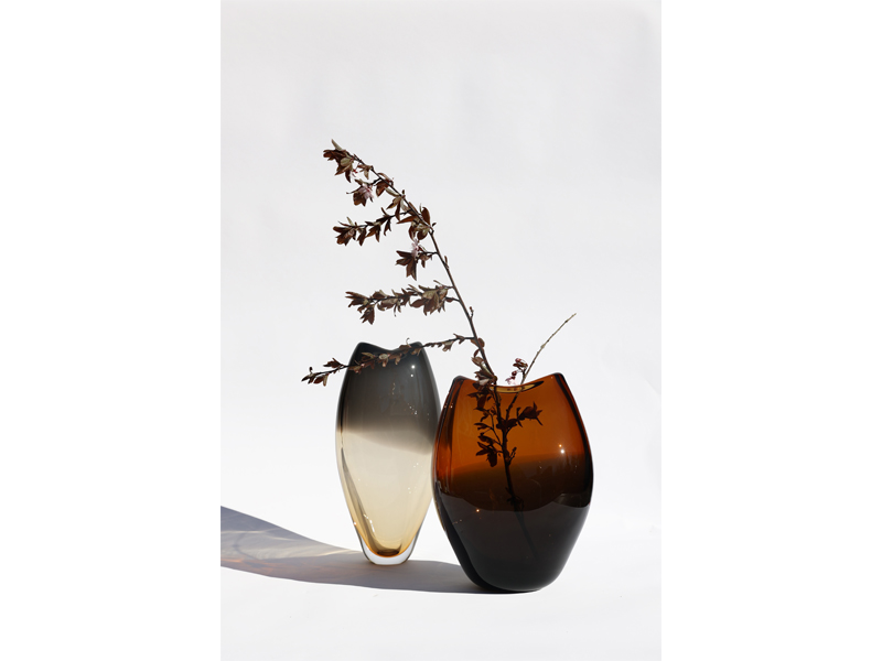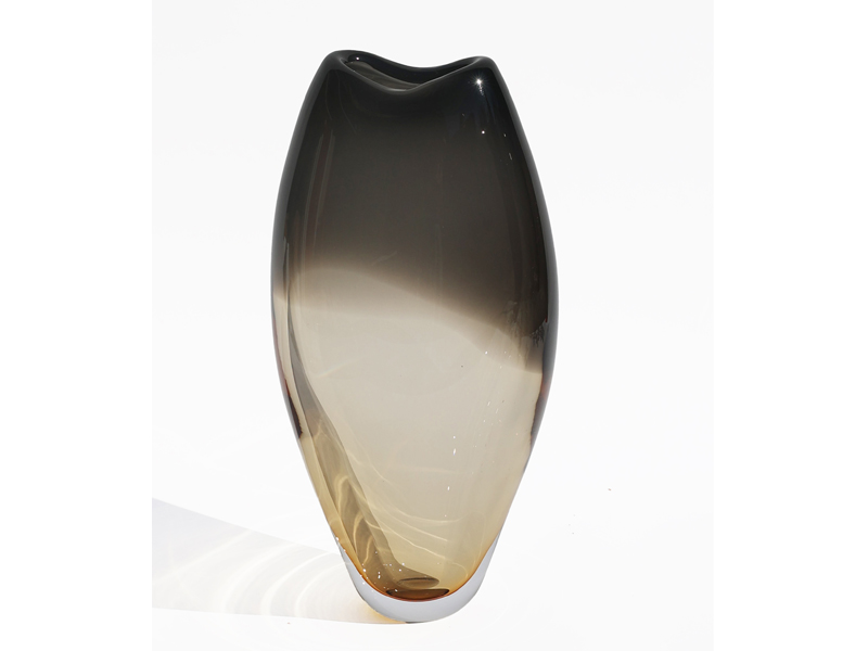 柔らかな非対称のシルエットと緩やかなカーブを描く縁は、花瓶に静かな動きを与え、厚く磨き上げられたガラスは重厚感と存在感を添えています。透明感と色彩の相互作用は、光と見る角度によって変化し、ダイナミックな視覚効果を生み出します。