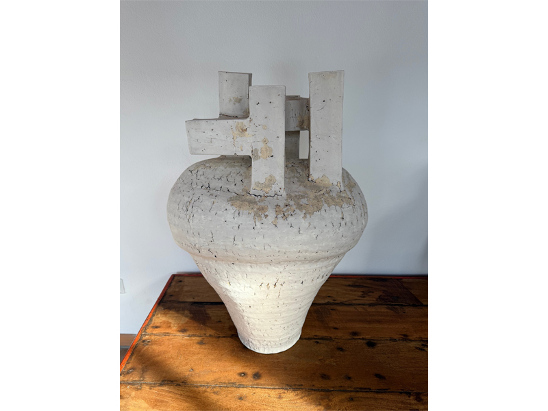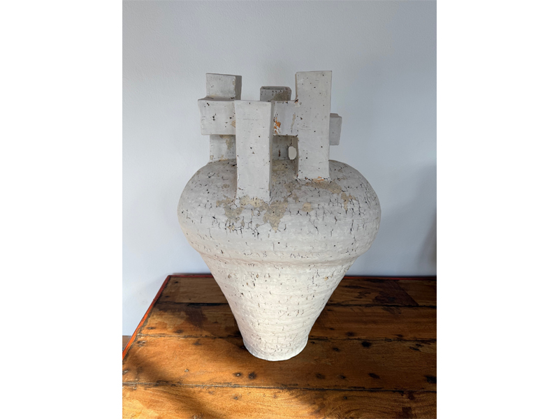ドイツのバウハウス美術館での展覧会のために制作されたこのオブジェは、バウハウス運動の理念を念頭に置き、工芸と芸術の融合を目指しデザインされました。 このオブジェの各パーツは、様々な影響の組み合わせによって形作られています。 ベースは伝統的な壺の形をしており、土を紐状にしてコイルのように巻き、ヘラで伸ばして作られていますが、丸みを作らず平らな形状にしています。 そして壺の開口部には交差する長方形の管で建築的な要素を加え、建物や橋のような構造を作り上げました。
