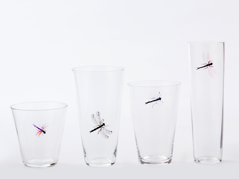 吹きガラスに、半透明なペイントで手描きしたトンボが軽妙なタッチのグラスです。形は4タイプです。
