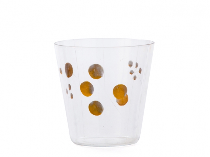 とても薄いガラスにベリーのグラフィカルパターンを金で手描きし、金部分は焼き付けて暖かみのあるマットな仕上げにしています。形は3タイプです。